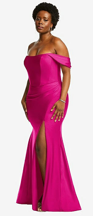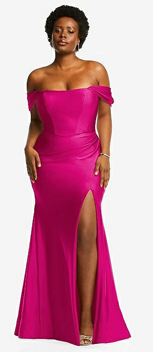 Off-the-Shoulder Corset Stretch Satin Mermaid Dress with Slight Train in think pink