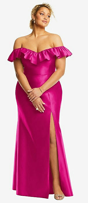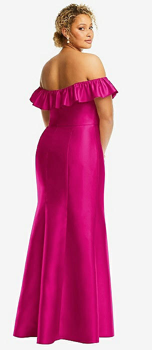 Off-the-Shoulder Ruffle Neck Satin Trumpet Gown in think pink
