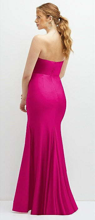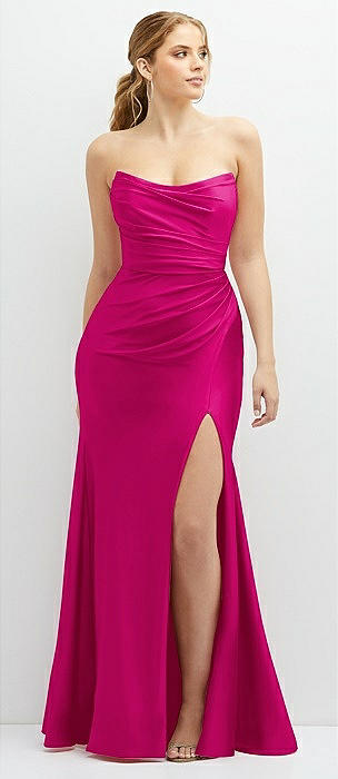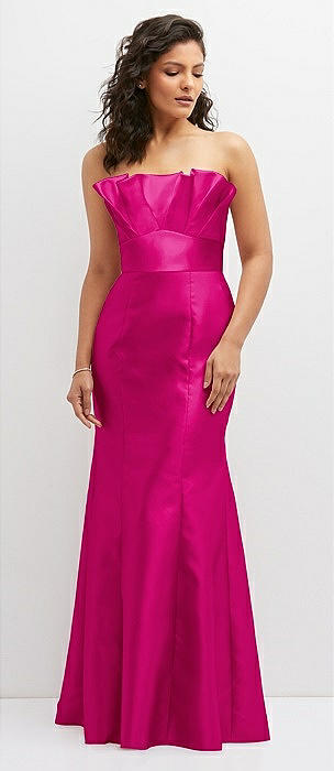 Strapless Basque-Neck Draped Stretch Satin Mermaid Dress with Horsehair Hem in think pink