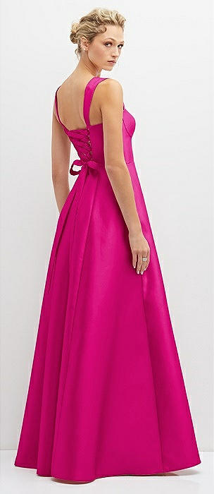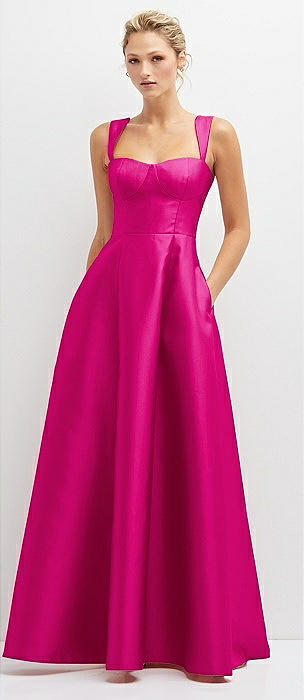 Lace-Up Back Bustier Satin Dress with Full Skirt and Pockets in think pink