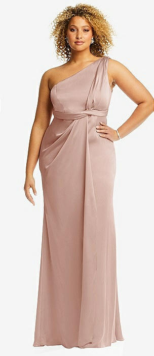 One-Shoulder Draped Skirt Satin Trumpet Gown in toasted sugar