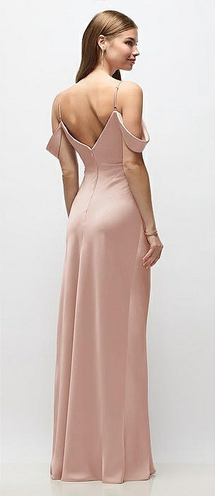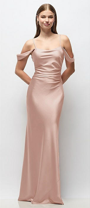 Off-the-Shoulder Swag Ruched Side Satin Bias Maxi Dress with Adjustable Spaghetti Straps in toasted sugar