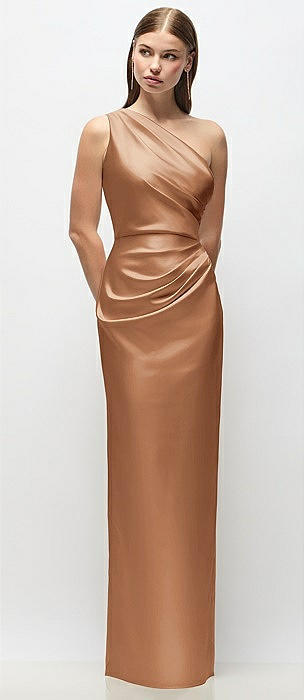 One-Shoulder Draped Bodice Stretch Satin Column Maxi Dress in toffee