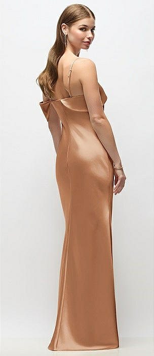 One-Shoulder Bias-Cut Satin Maxi Dress with Cascading Shoulder Bow in toffee