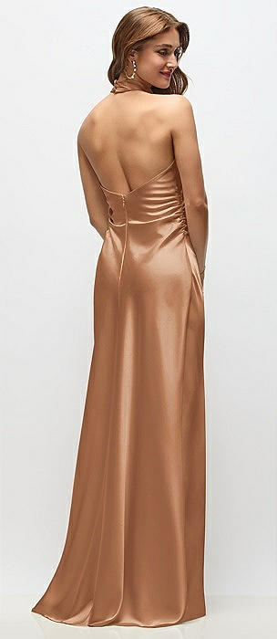 High Cowl Neck Open-Back Stretch Satin Bias Maxi Dress in toffee