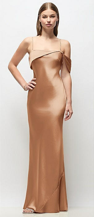 Asymmetrical Cuff Neck Stretch Satin Bias Maxi Dress with Adjustable Spaghetti Straps in toffee