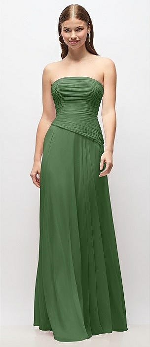 Strapless Chiffon Maxi Dress with Asymmetrical Ruched Drop Waist in vineyard green
