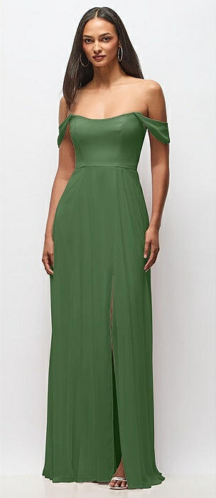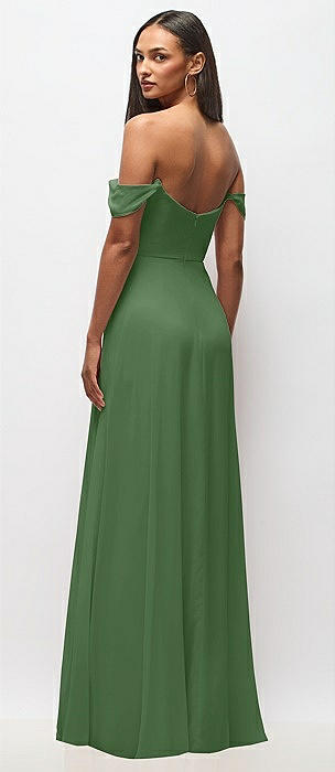 Bow-Shoulder V-Back Chiffon Gown with Front Slit in vineyard green