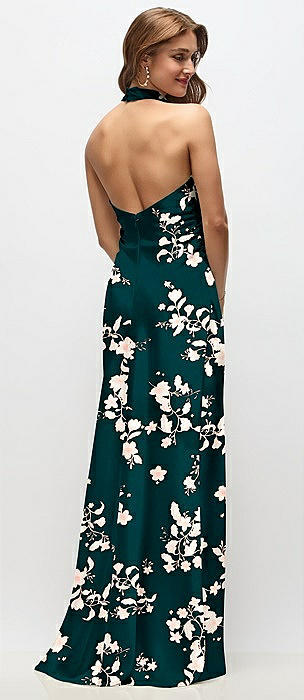 Draped Scarf Halter Open-Back Floral Stretch Satin Bias Maxi Dress with Adjustable Straps in vintage primrose evergreen