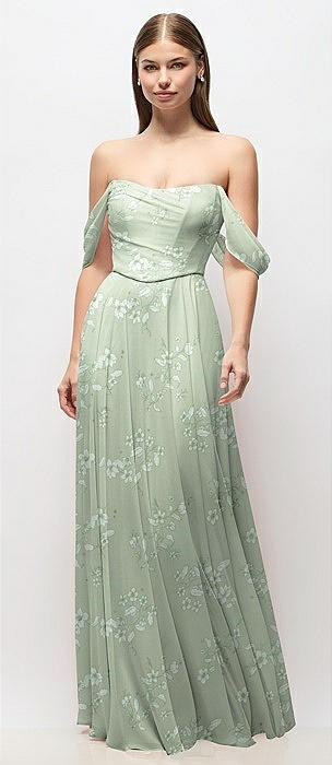 Off-the-Shoulder Basque Corset Floral Chiffon Maxi Dress in vintage primrose sage