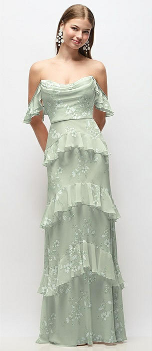 Off-the-Shoulder Cowl Floral Chiffon Tiered Ruffle Maxi Dress with Convertible Ruffle Straps in vintage primrose sage