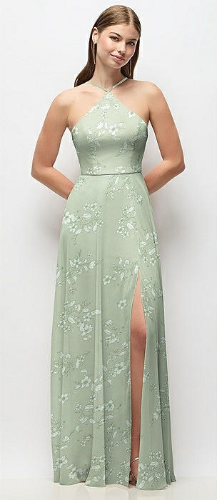 High-Neck Halter Floral Chiffon Maxi Dress with Adjustable Spaghetti Straps in vintage primrose sage