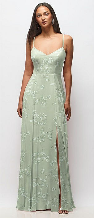 Wrap Bodice Floral Chiffon Maxi Dress with Adjustable Spaghetti Straps in vintage primrose sage