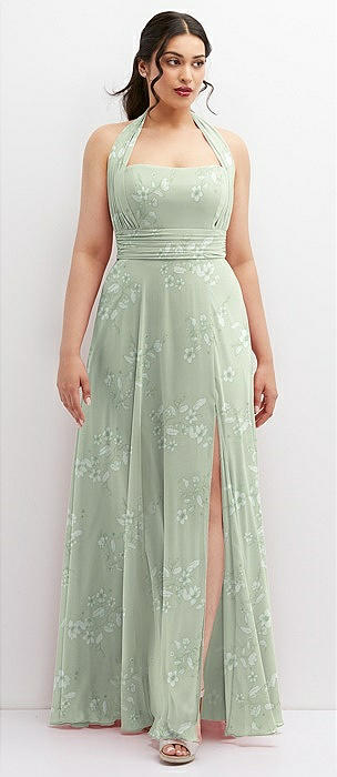 Shirred Skirt Jewel Neck Halter Dress with Front Slit in vintage primrose sage