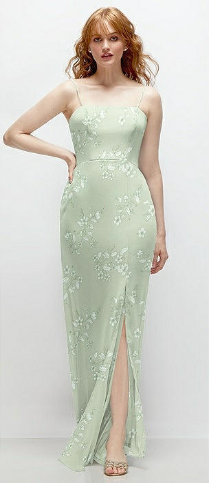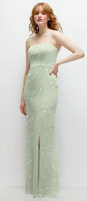 Spaghetti Strap Draped Skirt Gown with Front Slit in vintage primrose sage