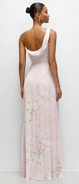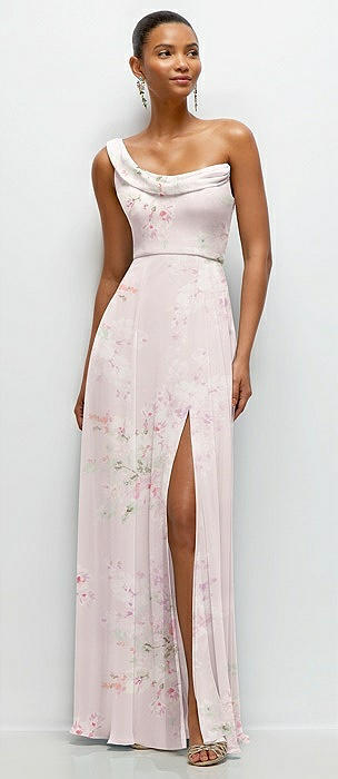 Chiffon One-Shoulder Maxi Dress with Draped Cowl Neckline in watercolor print