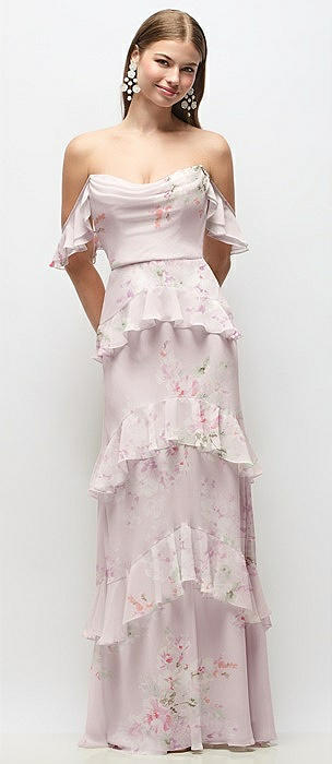 Off-the-Shoulder Cowl Floral Chiffon Tiered Ruffle Maxi Dress with Convertible Ruffle Straps in watercolor print