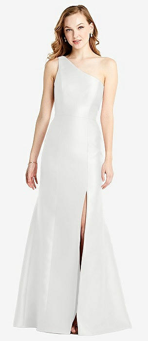 Deep V-back Satin Trumpet Dress with Cascading Bow at One Shoulder in white