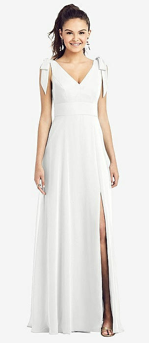 Bow-Shoulder V-Back Chiffon Gown with Front Slit in white