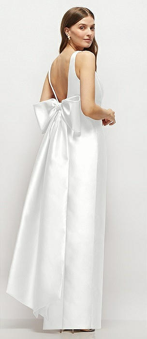 Deep V-back Satin Trumpet Dress with Cascading Bow at One Shoulder in white