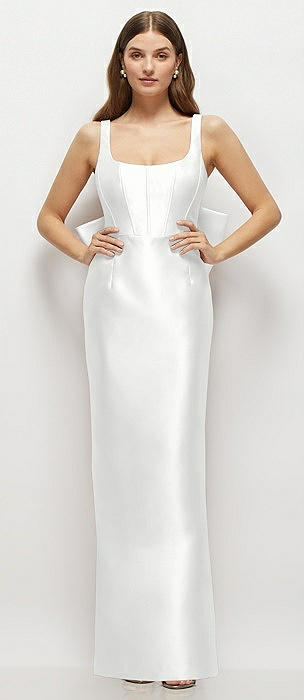 Scoop Neck Corset Satin Maxi Dress with Floor-Length Bow Tails in white