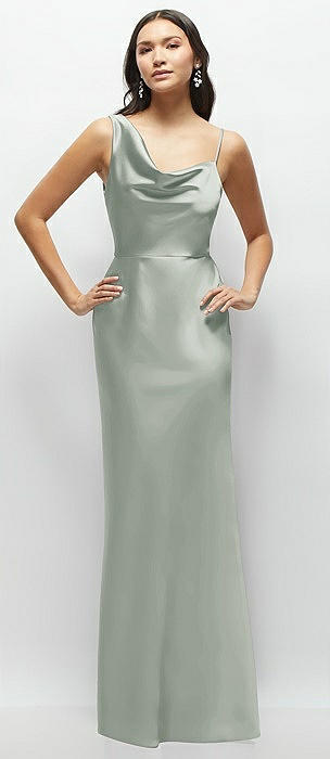 One-Shoulder Draped Cowl A-Line Satin Maxi Dress in willow green