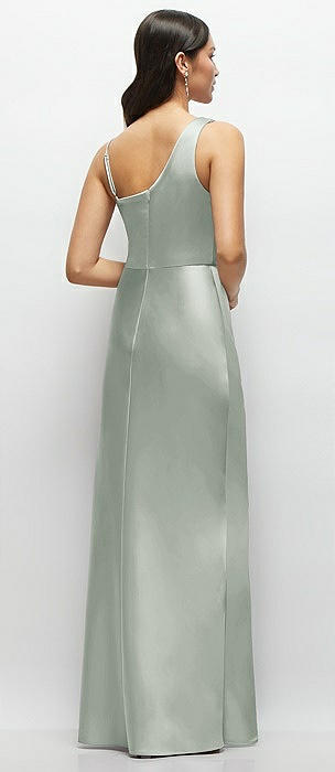 One-Shoulder Cat-Eye Neckline Fit and Flare Satin Maxi Dress in willow green