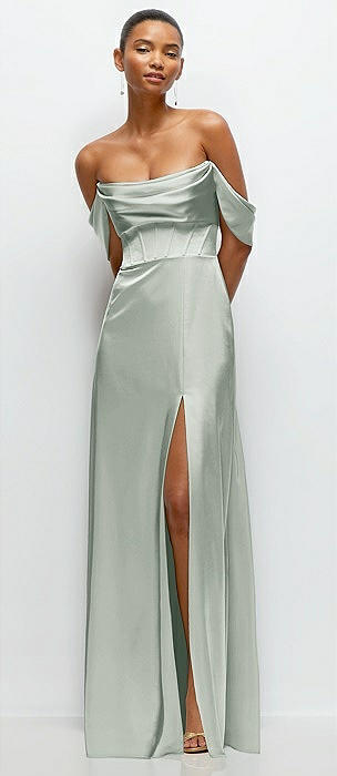 Cowl Neck Off-the-Shoulder Stretch Satin Fit and Flare Corset Maxi Dress in willow green