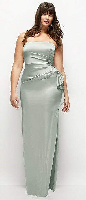 Strapless Draped Skirt Satin Maxi Dress with Cascade Ruffle in willow green