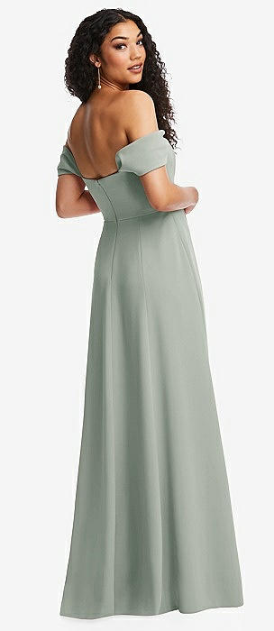 Bow-Shoulder V-Back Chiffon Gown with Front Slit in willow green