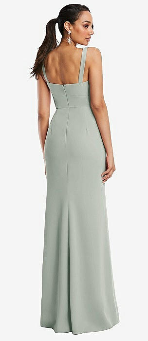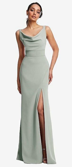 Cowl-Neck Wide Strap Crepe Trumpet Gown with Front Slit in willow green