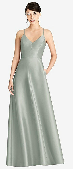 V-Neck Full Skirt Satin Maxi Dress in willow green